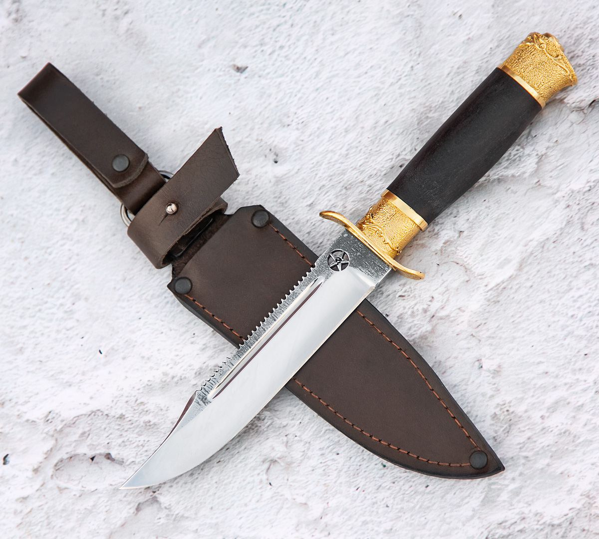 Нож Штрафбат из кованной нержавеющей стали 110Х18, рукоять - черный граб, кожаный чехол идет в комплекте.