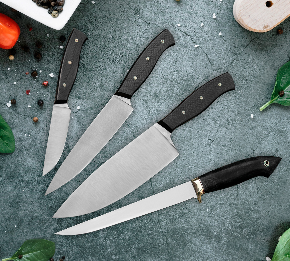 Набор Кухонных ножей из порошковой нержавеющей стали М-390, рукоять - карбон, подставка идет в комплекте.