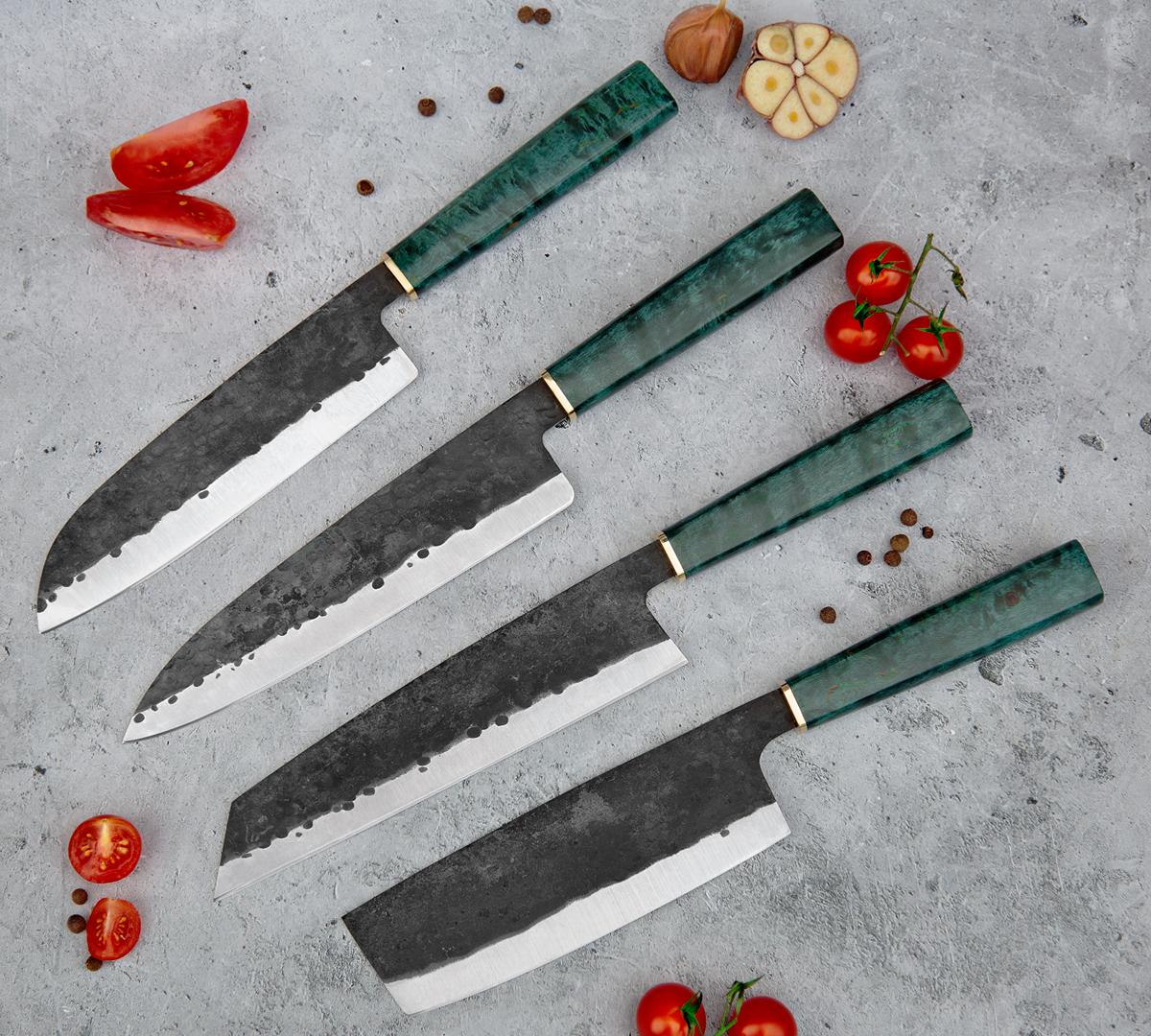 Набор кухонных ножей из стали N690, рукоять - стабилизированная карельская береза