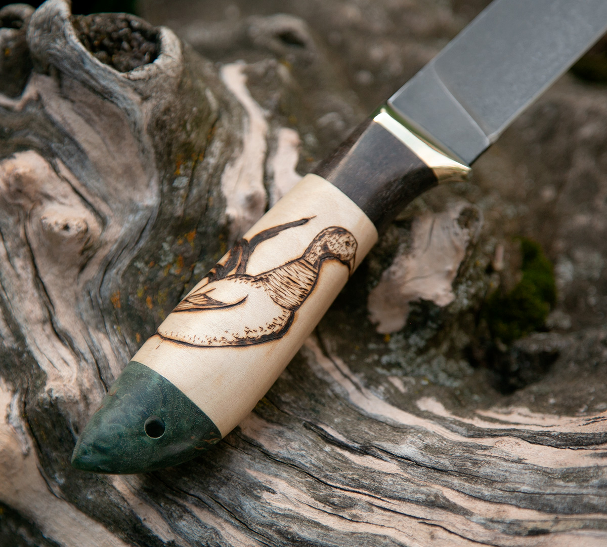 Нож Белка из булатной стали, рукоять - стабилизированная карельская береза, кожаный чехол идет в комплекте.