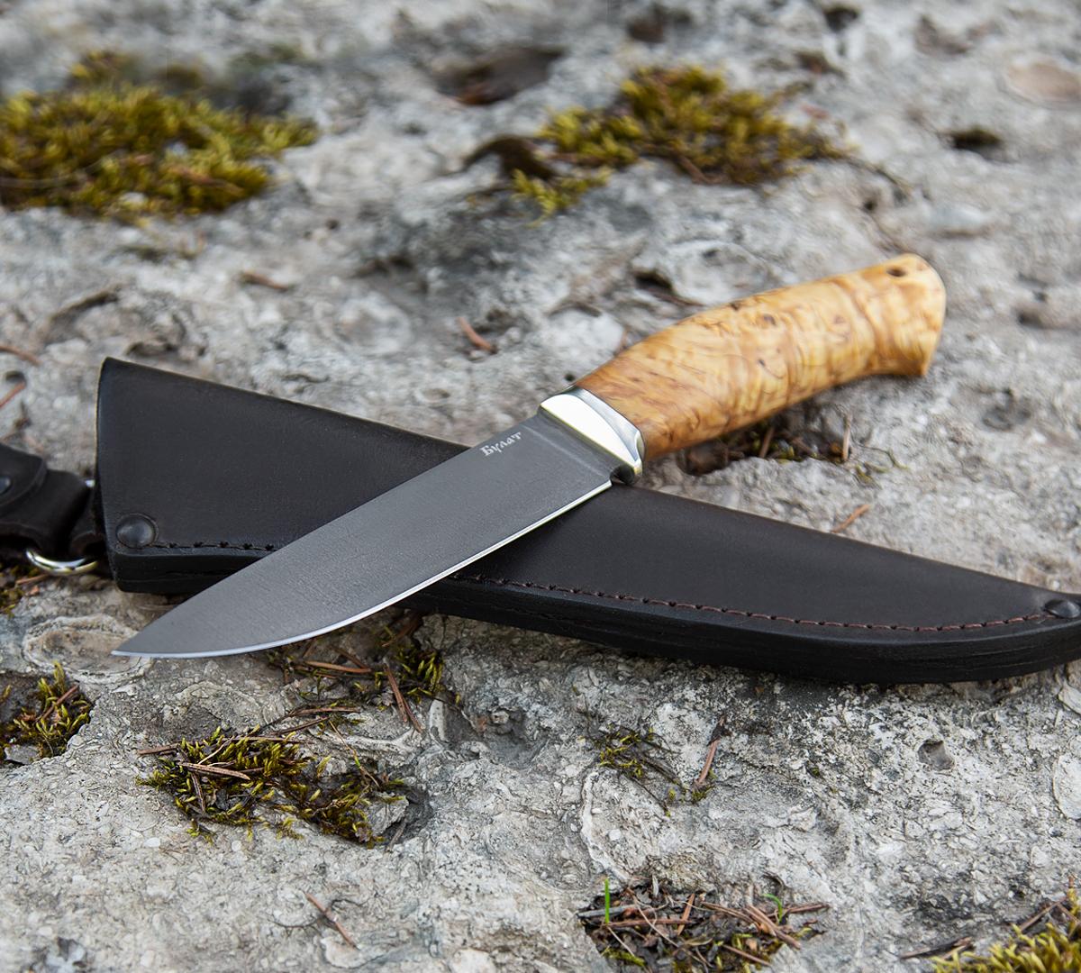 Нож Ладья из булатной стали, рукоять - стабилизированная карельская береза, кожаный чехол идет в комплекте.