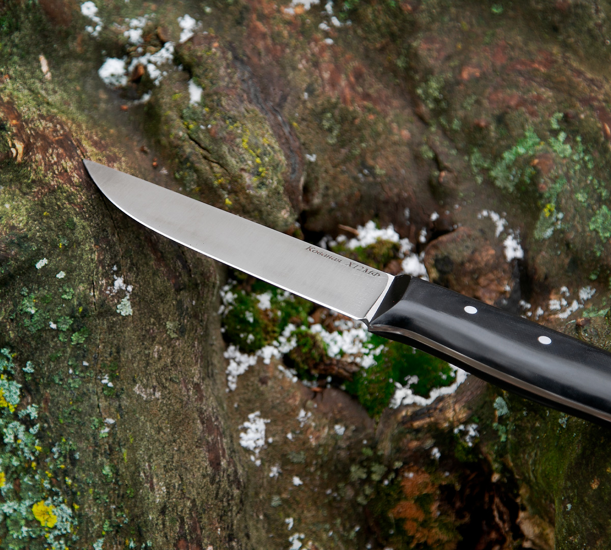 Цельнометаллический нож Ладья из кованной стали Х12МФ, рукоять - G10. Кожаный чехол в комплекте (может отличаться от фото)